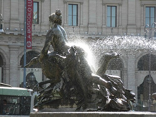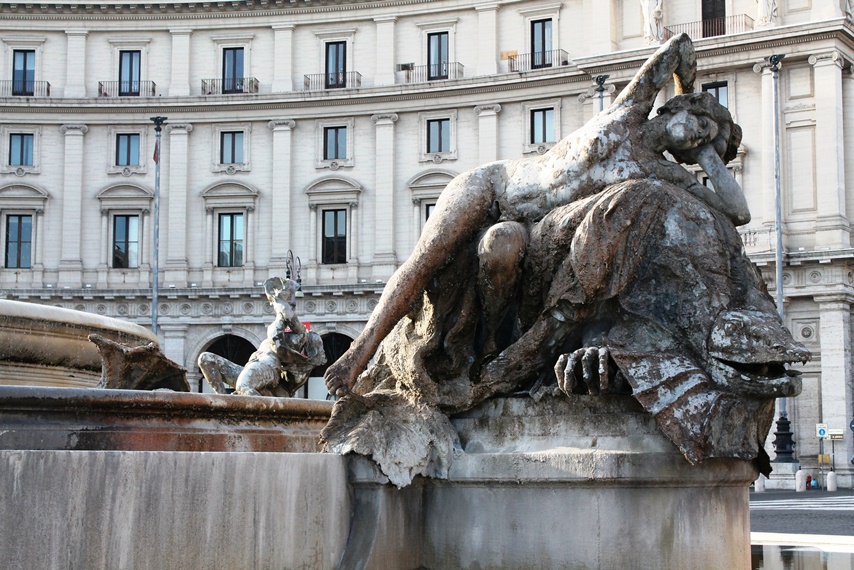 Sto cercando di non farmi investire dal traffico caotico di piazza della Repubblica e della vicina stazione Termini, e mi dirigo verso il centro della piazza dov’è collocata un’immensa fontana dai leggendari getti d’acqua. Piazza della Repubblica – un tempo piazza Esedra per la facciata curva della chiesa di Santa Maria degli Angeli – è stata per lungo tempo un cantiere proprio in virtù di questa scenografica fontana. Ci vollero, infatti, dieci anni per realizzarla a fine Ottocento. Vi lavorò lo scultore Mario Rutelli, bisnonno di un altro Rutelli che è stato recentemente sindaco di Roma.