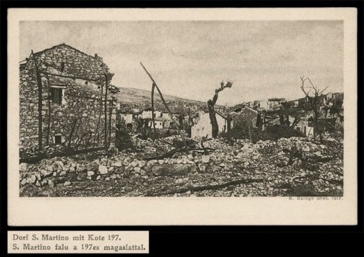 Ritornato al parcheggio, sono risalito in auto ed ho imboccato la strada in direzione San Martino. In breve tempo, sulla sinistra, ho incontrato le prime case del paese (quelle che nella famosa poesia di Ungaretti non erano che “qualche brandello di muro”) e proseguendo sono giunto in prossimità di una lapide sulla quale è incisa la famosa poesia di Ungaretti, “San Martino del Carso”.