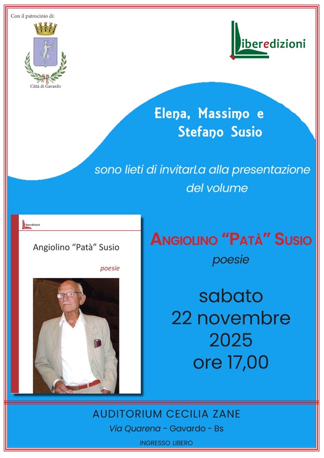 Sabato 22 alle ore 17 nell’Auditorium Cecilia Zane di Via Quarena a Gavardo verrà presentato il libro “Angiolino ‘Patà’ Susio” (Liberedizioni), scritto dai figli Elena, Massimo e Stefano.