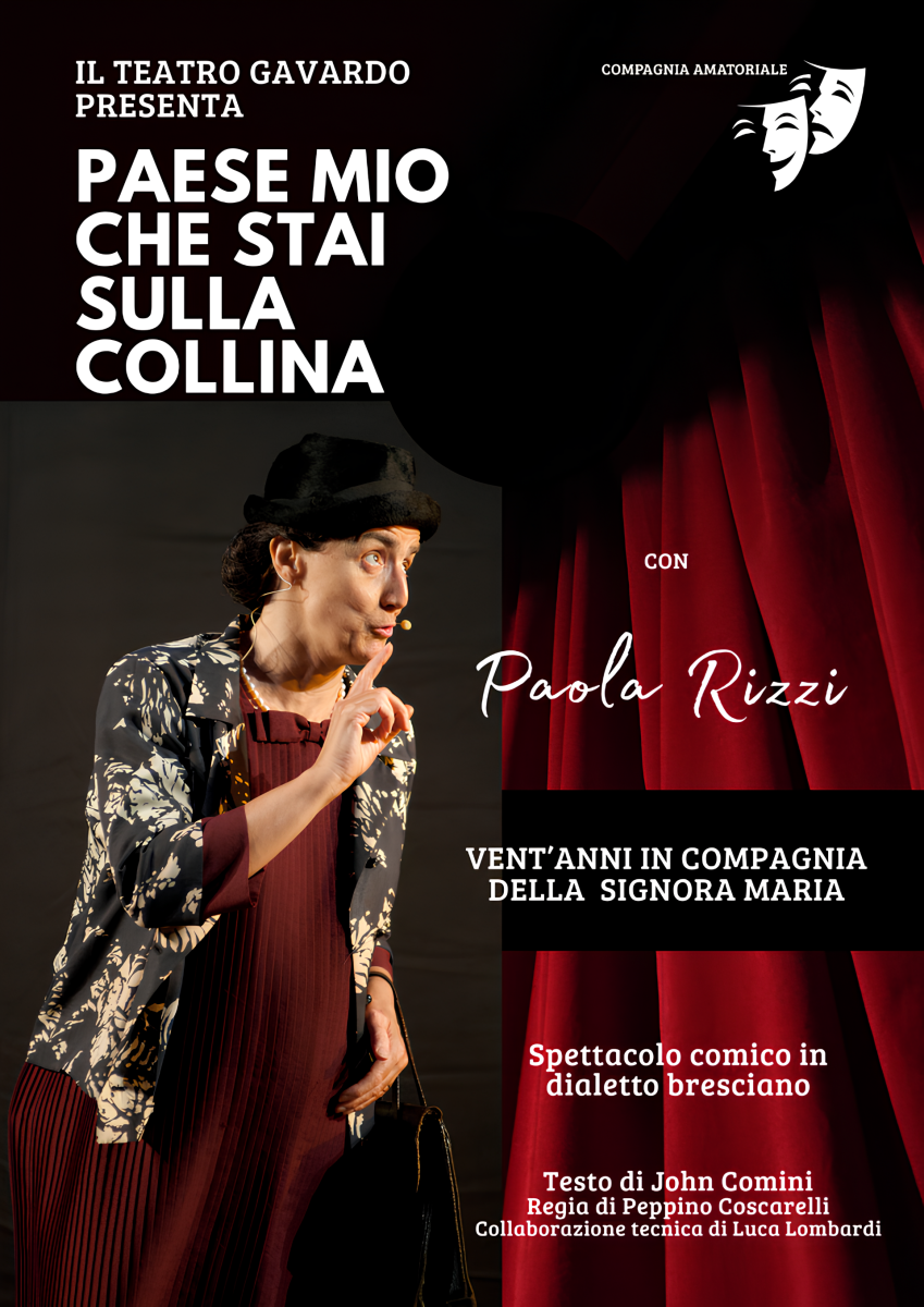 L’anno prossimo Paola Rizzi torna ad interpretare “Paese mio che stai sulla collina”, lo spettacolo comico da me ideato e scritto, che ha visto nascere il personaggio della Signora Maria venti anni fa, nel 2006. Sulla scia del primo monologo e per soddisfare le sempre più pressanti richieste, sono nati altri spettacoli sempre scritti da me con la preziosa collaborazione di Peppino Coscarelli. E nel 2016 ritorna “Paese mio” con nuove scene: già stanno piovendo le richieste, per la gioia dei numerosi fans della Signora Maria! Paola Rizzi partecipa ad altri eventi del Teatro Gavardo, come “Te recordet i temp endré” o la serata dedicata a don Pierluigi Murgioni, accanto ad Andrea Deni Giustacchini. Inoltre Paola Rizzi è interprete di un breve video dedicato al Commercio Equo e solidale, che viene proiettato al CTM di Rezzato durante i film.
