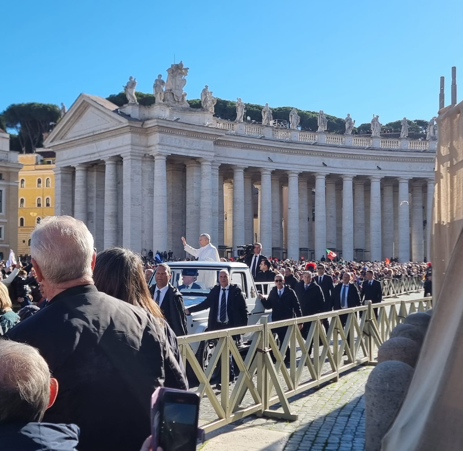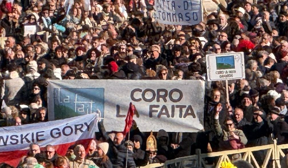 Infine sveglia prima dell’alba anche la domenica mattina per raggiungere in anticipo piazza San Pietro e trovare un posto seduti, accanto all’obelisco. Fortunatamente la giornata era splendida, anche se fredda. L’attesa dell’inizio della celebrazione con il Papa è stata lunga due ore e mezza, ma animata anche dai canti della Faita, applaudita dai pellegrini che erano vicini al coro, a poche decine di metri dall’obelisco, al centro della grande piazza abbracciata dal colonnato del Bernini.