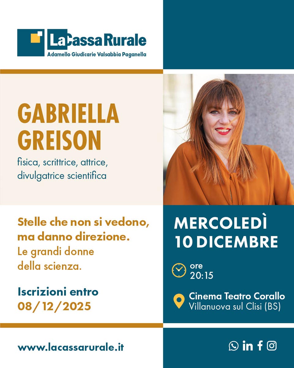 Mercoledì 10 dicembre alle ore 20:15, sul palco del Cinema Teatro Corallo di Villanuova sul Clisi, salirà Gabriella Greison, fisica e narratrice di meccanica quantistica, ma anche performer teatrale e divulgatrice scientifica.