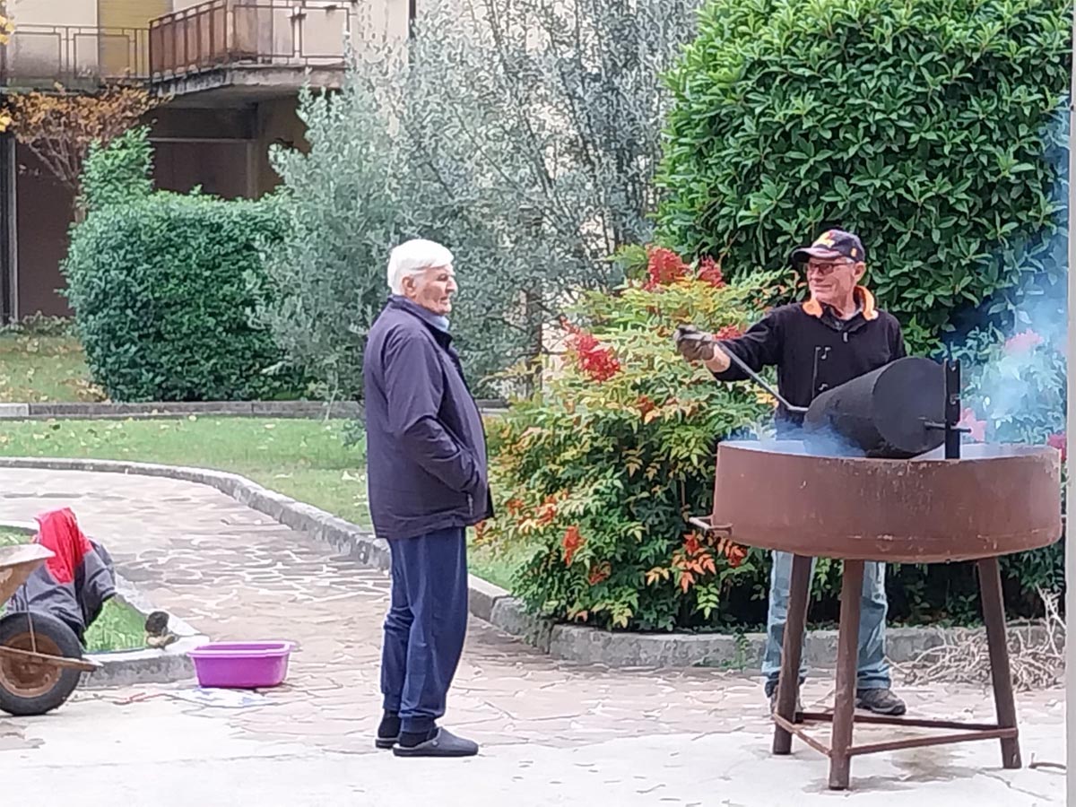 Alcuni volontari nel cortile (tra i quali Elisa Bertera detta Lisi, insieme a Piero Bertuzzi con la moglie) cuocevano le castagne; hanno dato il proprio contributo, sbucciando le castagne, la cuoca Elena con la figlia Elisa, aiutate da Gaia, insieme all’efficiente personale di assistenza.