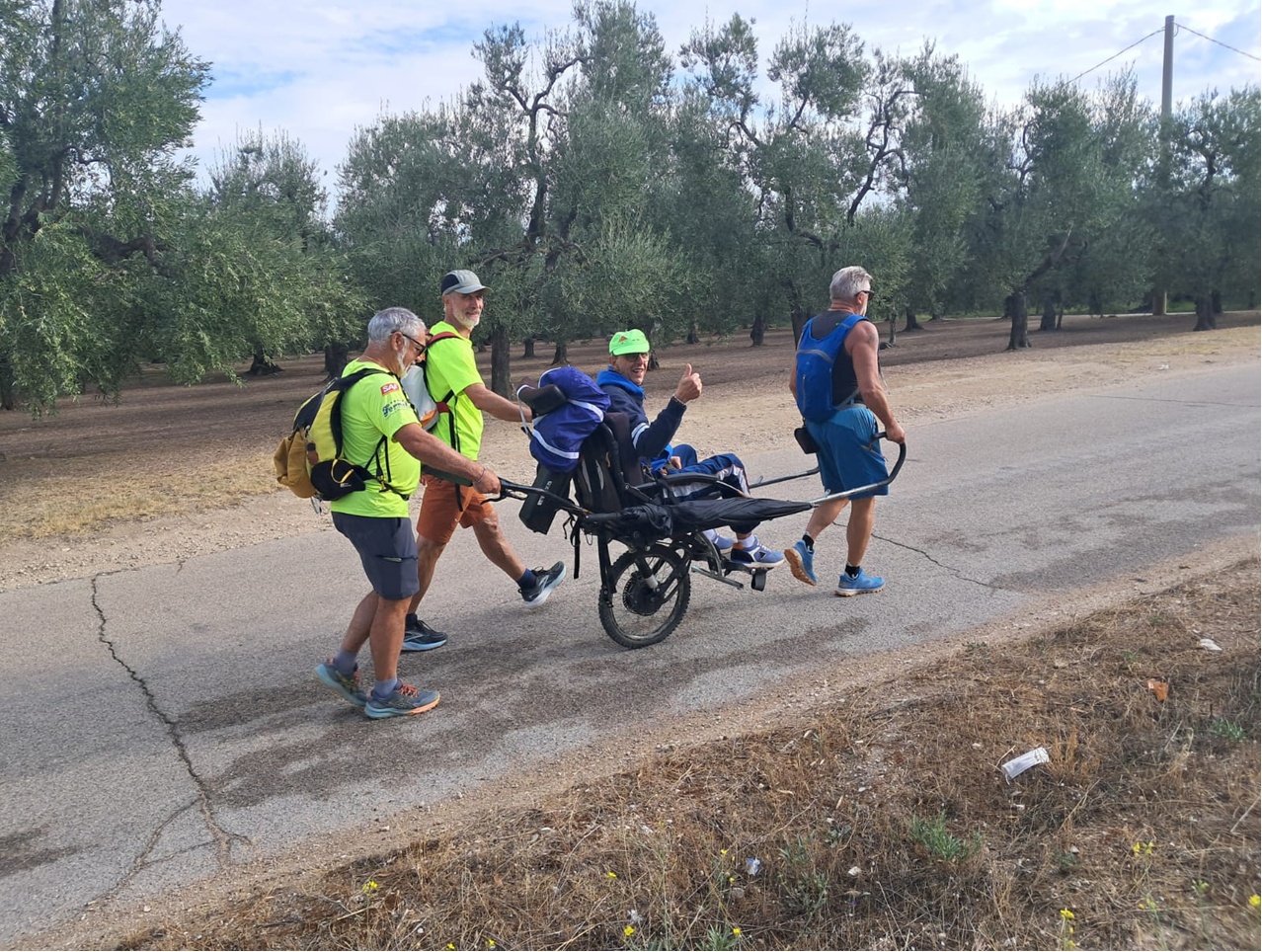 La settimana con Massimo in joëlette, accudito dal fido cognato Nicolino, è trascorsa senza scossoni (questi è originario di San Paolo di Civitate, borgo pugliese attraversato la scorsa settimana). Il gruppo di “trascinatori” si è ingrossato con l’arrivo delle forze fresche Geo e Cisco ed il Cardinale (subentrato all’Ammiraglio) ha dovuto sudare sette camicie per tenere a bada Dori, Assunta, Cecilia e Grazia.