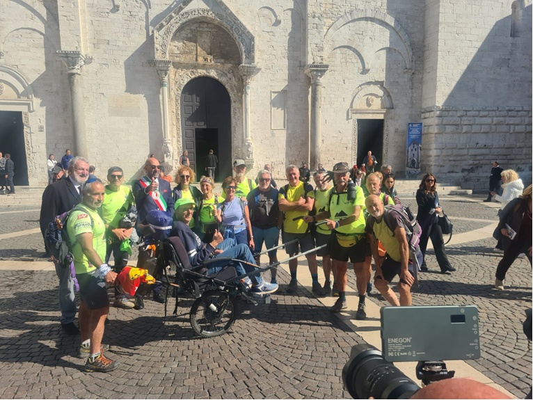 A Ruvo di Puglia sono rimasti incantati dalla cattedrale di Santa Maria Assunta, definita dal pittore Guttuso “capolavoro del romanico contadino”. A Bitonto, sono entrati in territorio di Salvatore Labianca, instancabile guida del Gruppo. Una delegazione è stata ricevuta a Palazzo Gentile dal Sindaco Francesco Ricci, con scambio di libri e gagliardetto. Dopodiché hanno visitato la cattedrale di San Valentino, edificata dai benedettini nel XII secolo. Nell’ultima tappa della quarta settimana, i nostri amici sono approdati finalmente sul Mediterraneo e, percorso il lungomare di Bari, hanno raggiunto la maestosa basilica di San Nicola, luogo simbolo del pellegrinaggio medievale ed anche dei giorni nostri. Nella piazza, Salvatore è riuscito ad intrufolarsi nel drappello di autorità in attesa del Presidente della Lituania ed ha presentato l’iniziativa del CAI Gavardo all’arcivescovo di Bari e Bitonto, Giuseppe Satriano; al Presidente della Regione Puglia, Michele Emiliano ed al Sindaco di Bari, Vito Leccese.