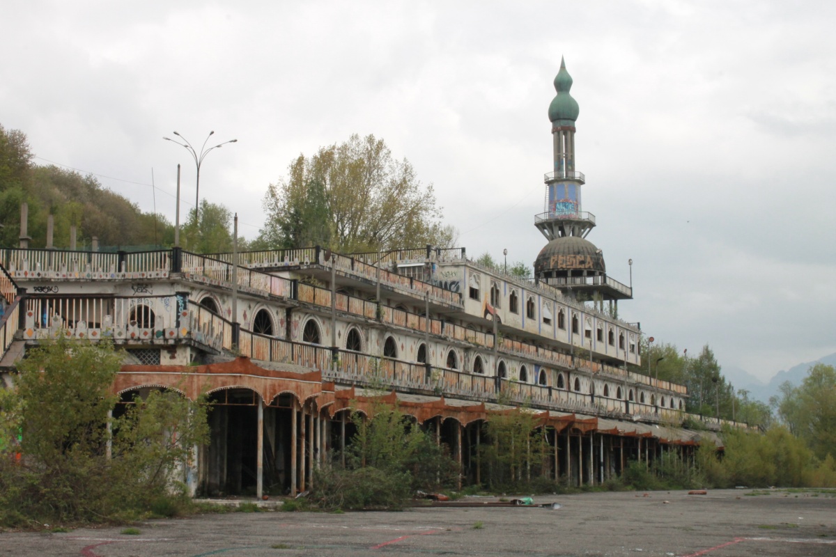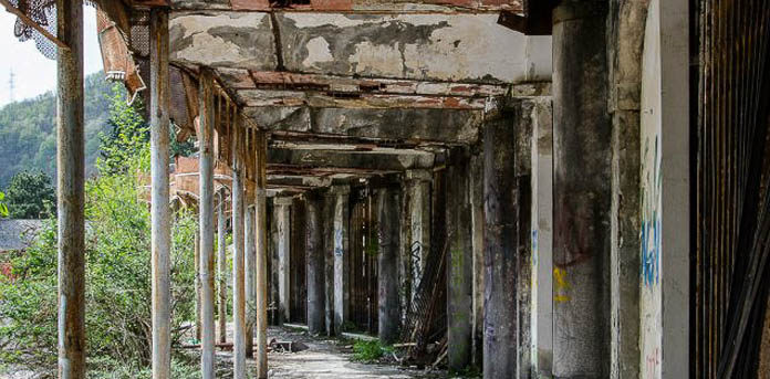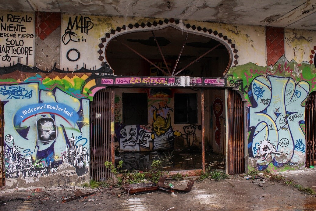 Il cielo azzurro di Consonno presto comincia però a rannuvolarsi. Giungono gli anni 70. Il piombo, le bombe, la crisi petrolifera seguita da quella economica, cominciano a pesare. Inoltre, il nuovo interesse per le problematiche ambientali, spinge alcuni gruppi e associazioni a segnalare al comune di Lecco i pericoli derivanti dal dissesto idrogeogologico creatosi nella zona, che porta anche a una prima denuncia da parte di Italia Nostra. Il turismo cala e Consonno registra i primi fallimenti. Alcuni negozi e ristoranti cominciano a chiudere. Nel 1976, quasi a confermare quanto più volte segnalato, una frana spazza via trecento metri della strada che porta al parco. Consonno inizia lentamente a morire. Il cielo azzurro del fantasioso luna park diventa il grigio cielo di una città fantasma. Consonno langue nell’abbandono per anni finché a darle il colpo di grazia un partecipatissimo rave party che nel 2007 vede presenti a Consonno più di mille persone che la devastano, la riempiono di disegni street-art e se ne vanno lasciandola nello stato in cui è ancora possibile vederla oggi. L’oblio piomba su Consonno con una velocità quasi fulminea così come velocemente erano state prese tutte le decisioni all’atto della sua costruzione. Il conte Bagno era infatti stato soprannominato “conte Amen” per la rapidità con la quale decideva e agiva, spinto solo dall’ambizione di creare quel suo sogno.