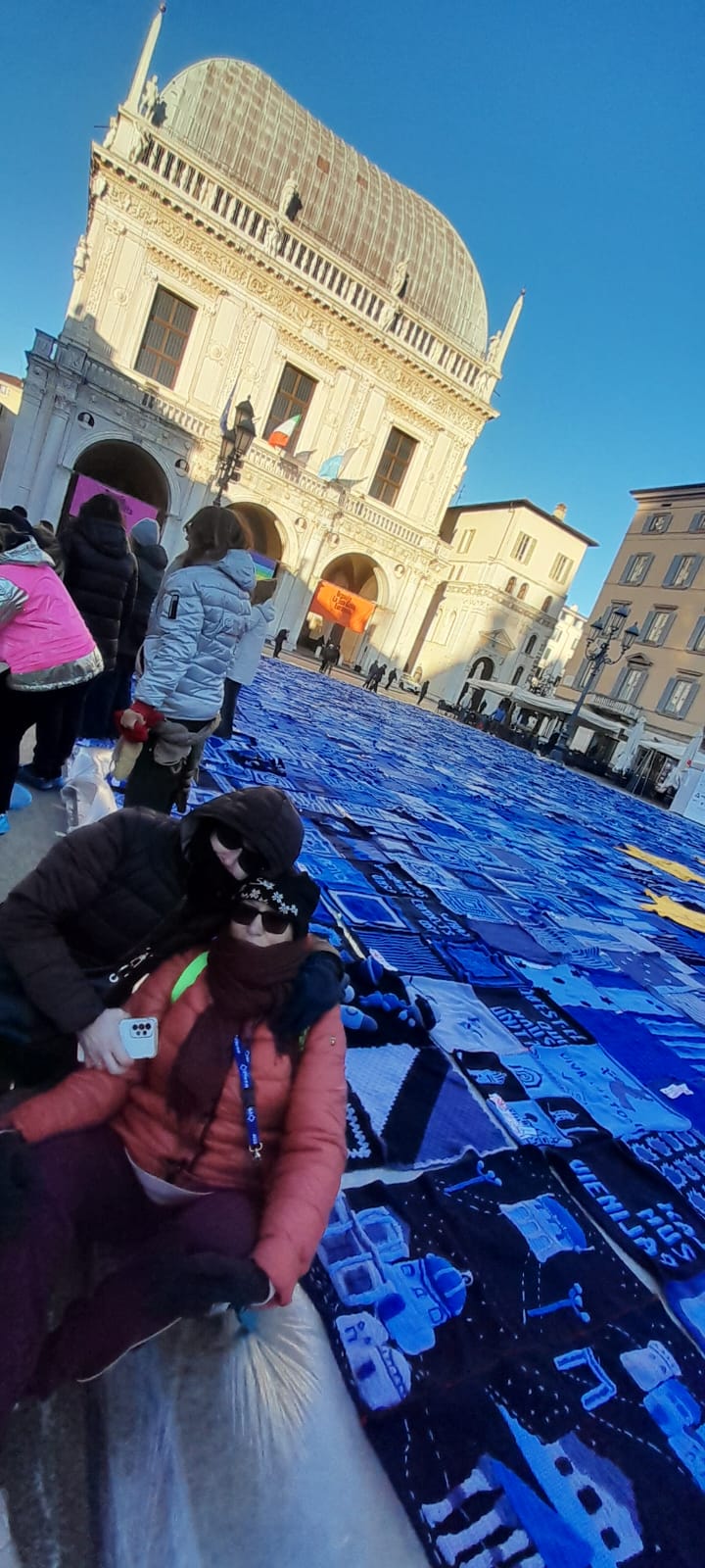 “Eccoci qua, l’avventura alla quale come gruppo Per-corso di filato di Villanuova sul Clisi abbiamo aderito è arrivata al suo epilogo. Entusiasmante la proposta: coprire Piazza Loggia in città con una bandiera dell’Europa con quadrotti di lana fatti a maglia o all’uncinetto nelle tonalità dell’azzurro, commissionati a VivaVittoria dall’amministrazione comunale cittadina.