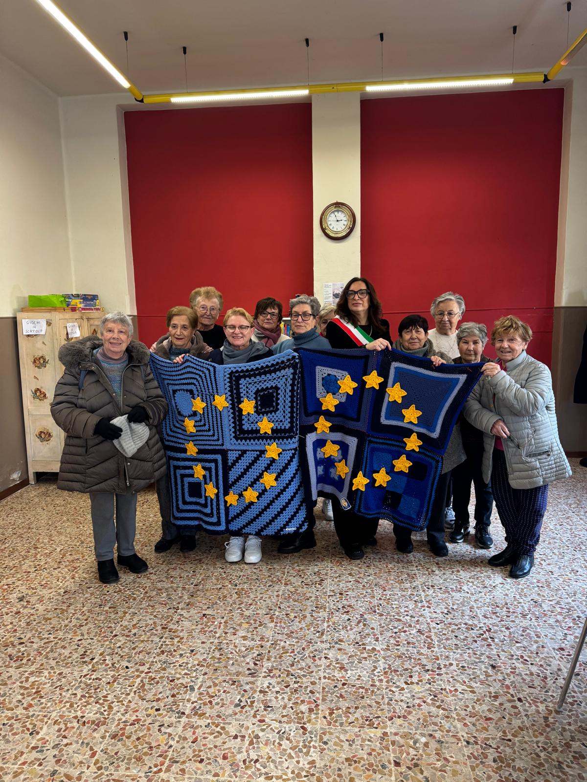 Piccolo seguito in quel di Villanuova. Mercoledì 3 dicembre, pomeriggio di sferruzzo all’Oratorio San Luigi. Il gruppo per-corso di filato ha pensato, vista la collaborazione avuta con l’amministrazione comunale per la catena umana Brescia-Bergamo il 4 giugno 2023, di consegnare una coperta al municipio nella persona del sindaco Caterina Dusi e all’Oratorio, che ci accoglie tutti i mercoledì ed è luogo di aggregazione per la formazione dei giovani. Come per le strisce del 2023, anche le coperte donate potranno essere esposte come messaggio di pace partito dal festival della pace di Brescia.” Grazie Ceci, e complimenti, belle ragazze!