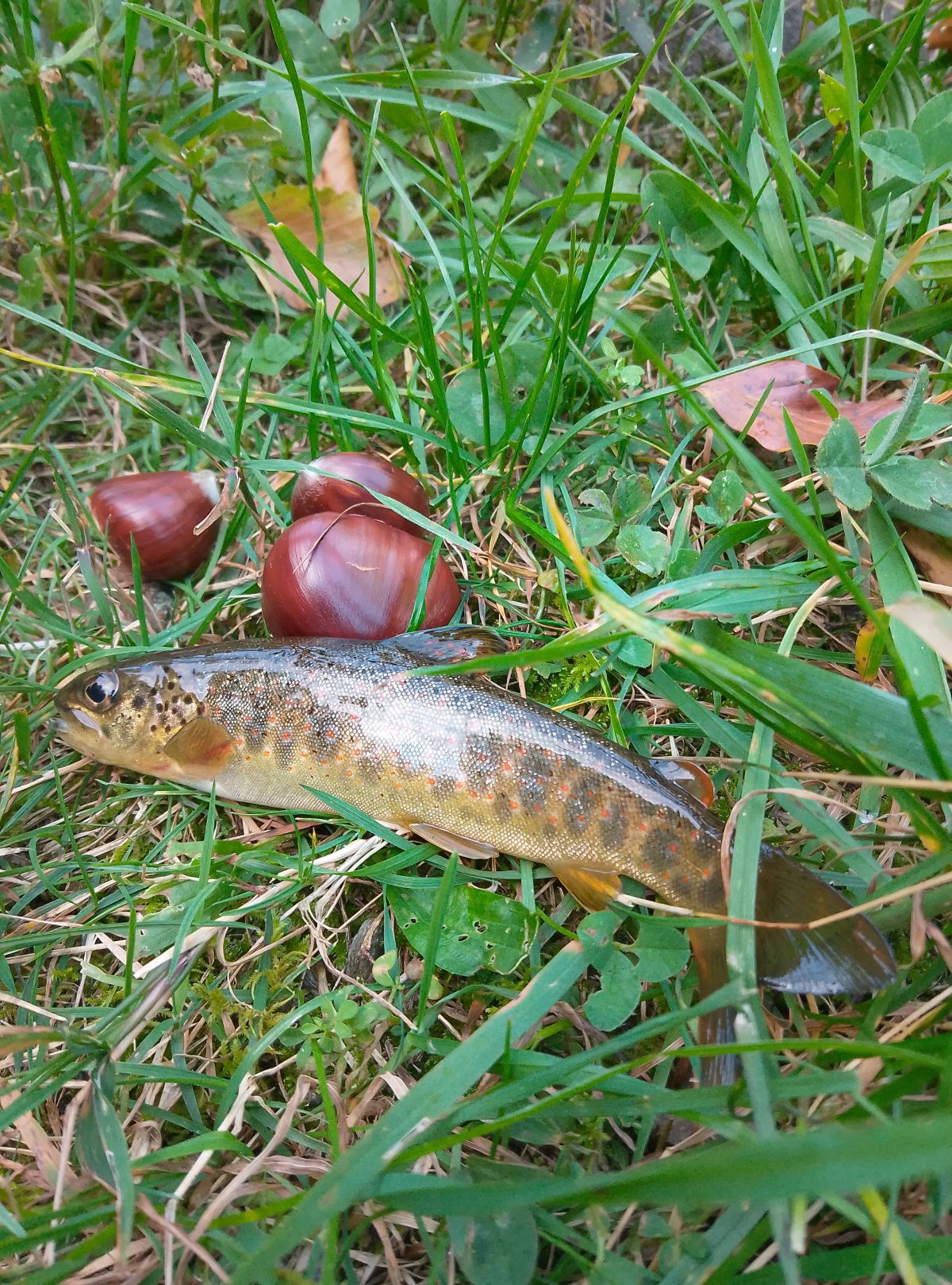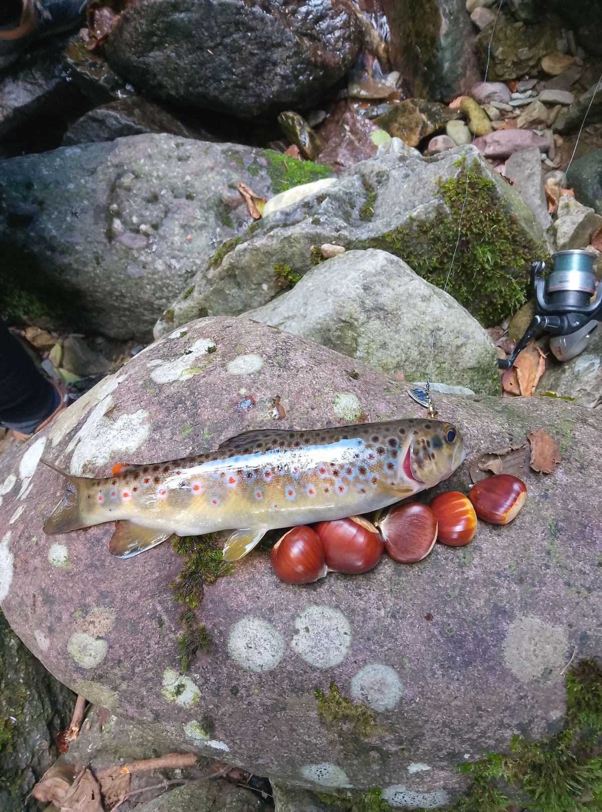 Proseguo quindi a raccogliere castagne, ben più numerose dei nostri amici pinnuti. Riesco comunque a ingannare una piccola fario in una buca davvero affascinante e a metterla in posa per la foto di chiusura, prima del rilascio.