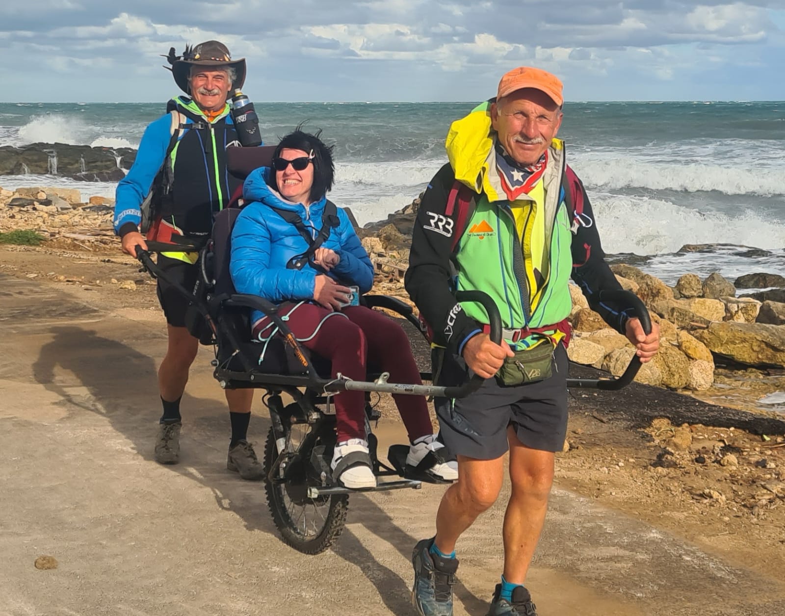 Nella quinta settimana è ritornata a far visita al Gruppo quell’indemoniata di Vanessa, accudita da Valentina ma è arrivata pure Franca, accompagnata da Paola. Nicolino, salutato il cognato Massimo, ha deciso di aggregarsi ai Volontari, aiutandoli a trainare la joëlette fino a Santa Maria di Leuca, peraltro in buona compagnia perché, per la sesta settimana, sono arrivati i rinforzi di Raimondo, Barny, Stefano, Pierantonio e del Presidente del C.A.I. Gavardo, Emiliano. Col groppo in gola, Vanessa e Paola sono ripartite ed al loro posto sono subentrate Alessandra, Licia e Nadia.