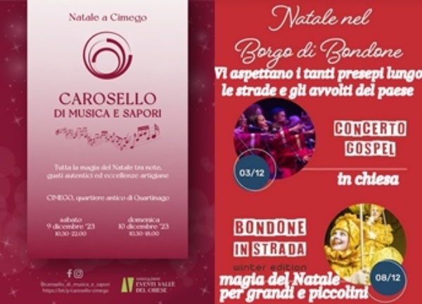 Le luci calde e, soprattutto, le melodie del Natale più autentico faranno anche da sfondo al Carosello di Musica e Sapori che animerà l’antico borgo di Quartinago di Cimego (comune di Borgo Chiese) nelle giornate di sabato 9 e domenica 10 dicembre.